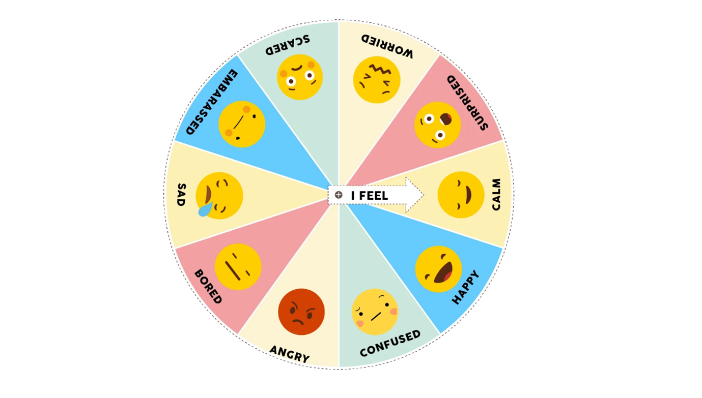 Then using the Wheel of Emotions Chart below, take turns to spin the wheel and share with the group what do you usually do when you are feeling this feeling or how can you usually identify this feeling or emotion? For example, when I feel embarrassed, my palms get sweaty, and my cheeks feel red and warm.